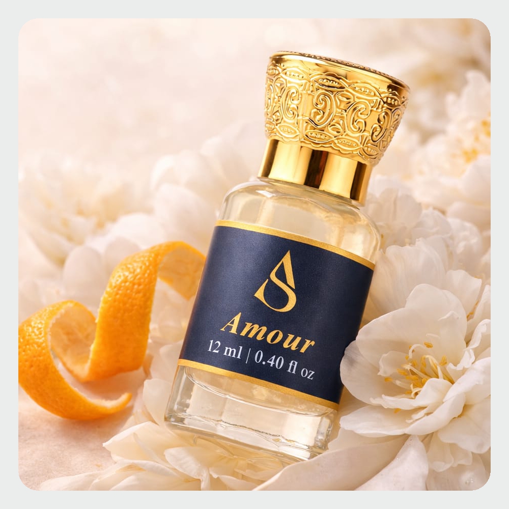 Amour perfume roll-on stands out because it combines fresh citrus brightness with soft florals and a warm woody base. The opening feels light and uplifting, the heart remains smooth and elegant, and the base gives the fragrance a subtle depth.