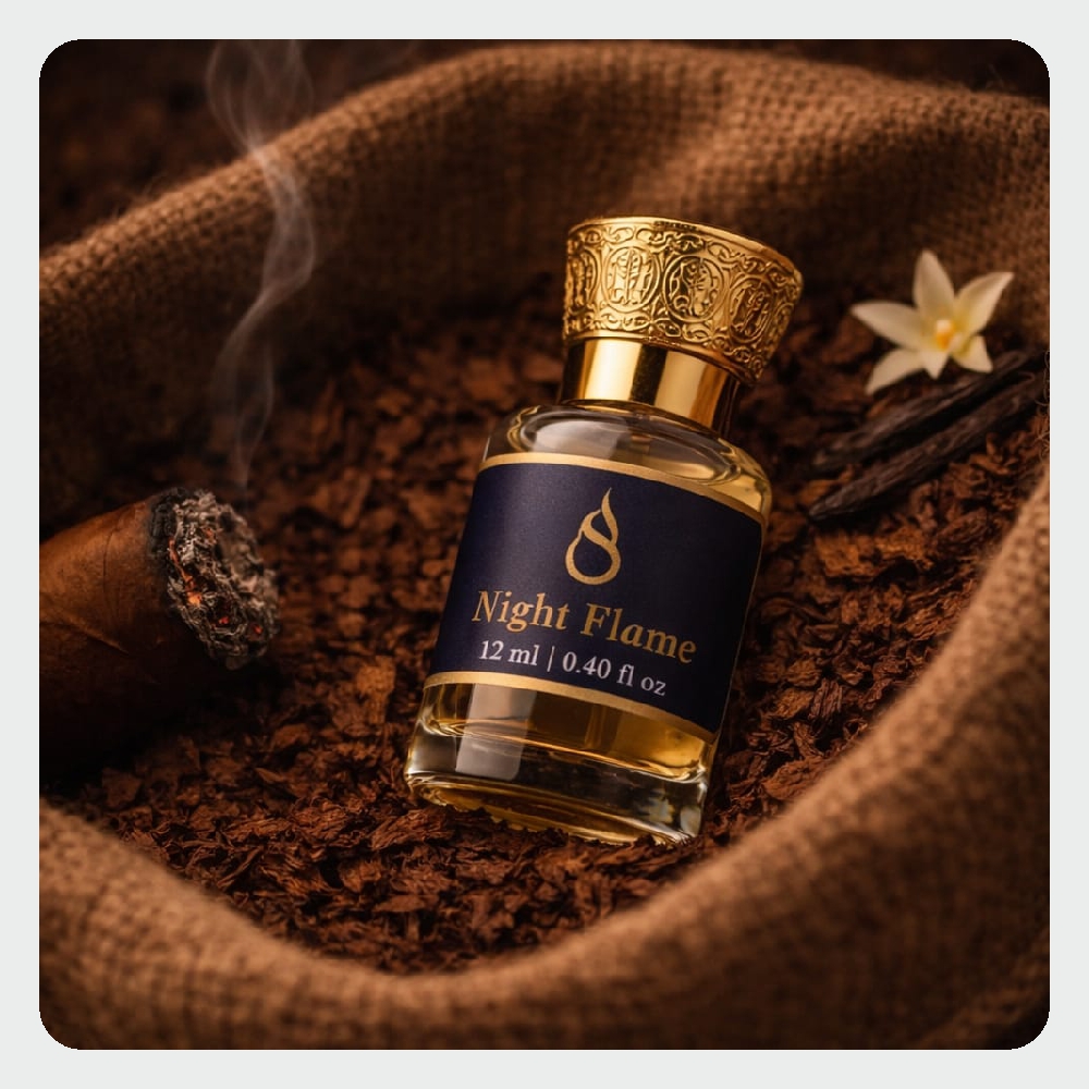Night Flame perfume roll-on stands out because it combines smoky tobacco richness with sweet vanilla, cacao warmth, and spicy depth. The fragrance evolves from bold to smooth, creating a complete and well-balanced scent experience.