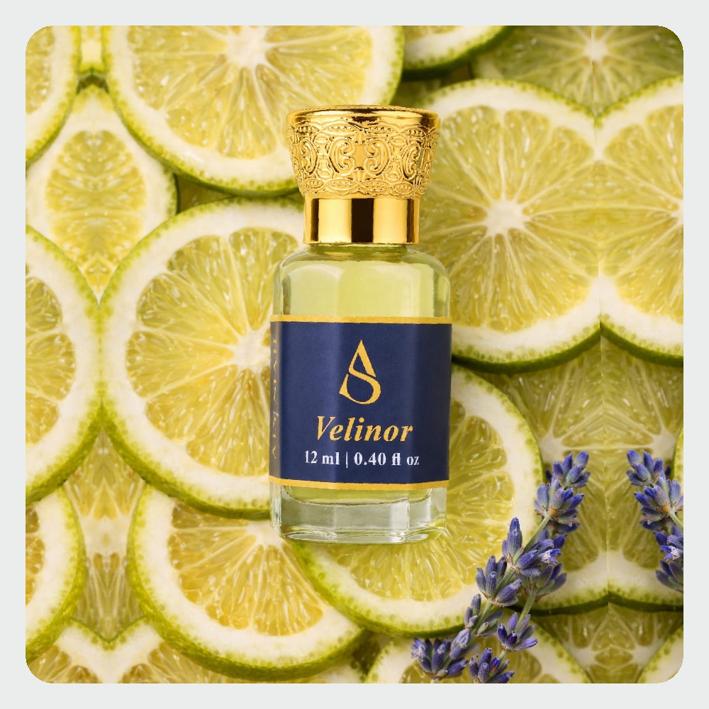 Velinor perfume roll-on stands out because it combines fresh citrus brightness with herbal aromatic smoothness and a warm woody base. The opening feels energetic and clean, while the base keeps the fragrance grounded and elegant.